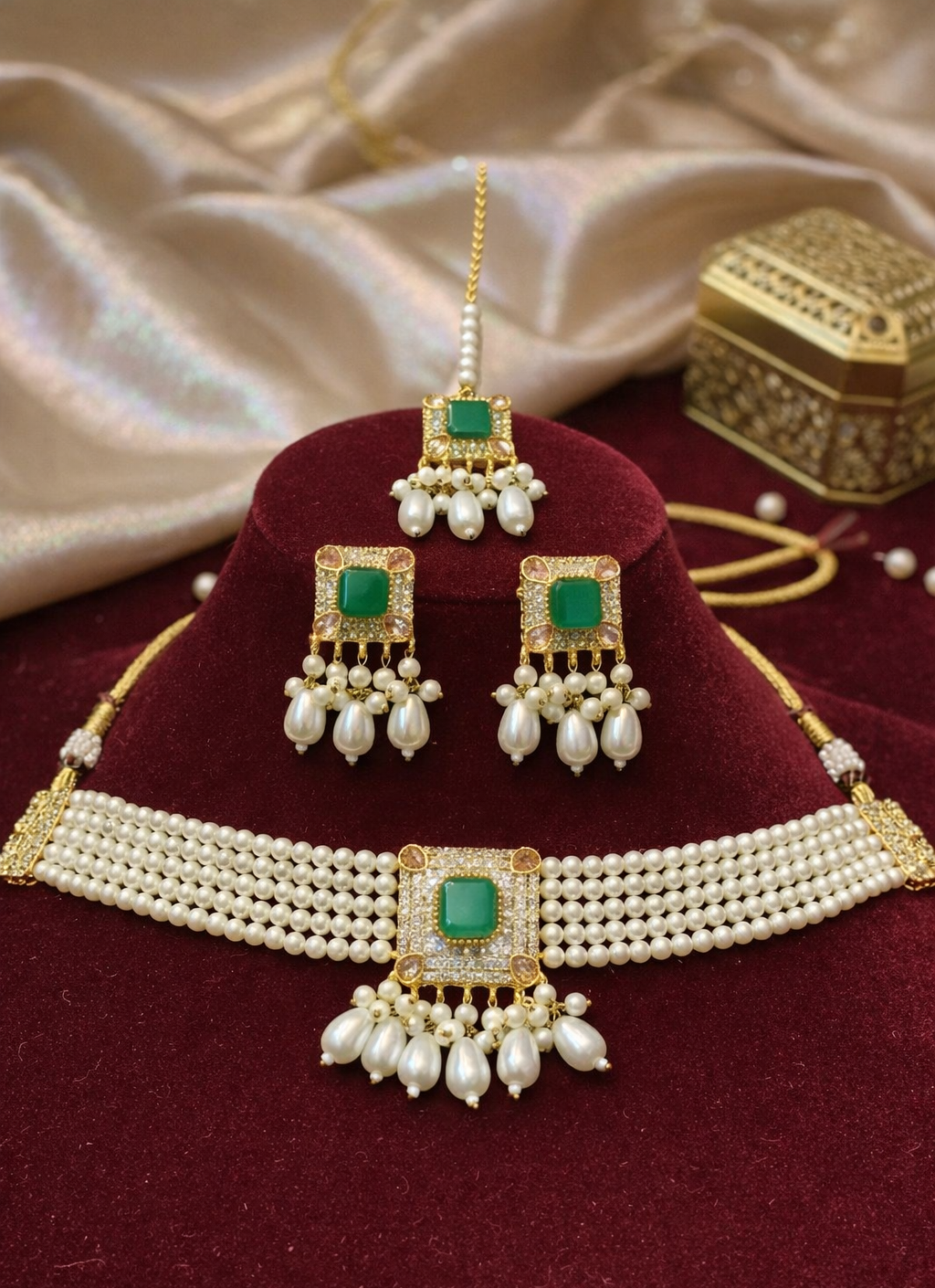 This exquisite traditional jewelry set includes a beautifully designed necklace and matching earrings adorned with stones, pearls, and intricate enamel work. The gold-plated finish adds a royal touch, making it ideal for weddings, festive occasions, or cultural events. A perfect blend of grace and glamour, this set enhances any ethnic outfit with timeless charm.