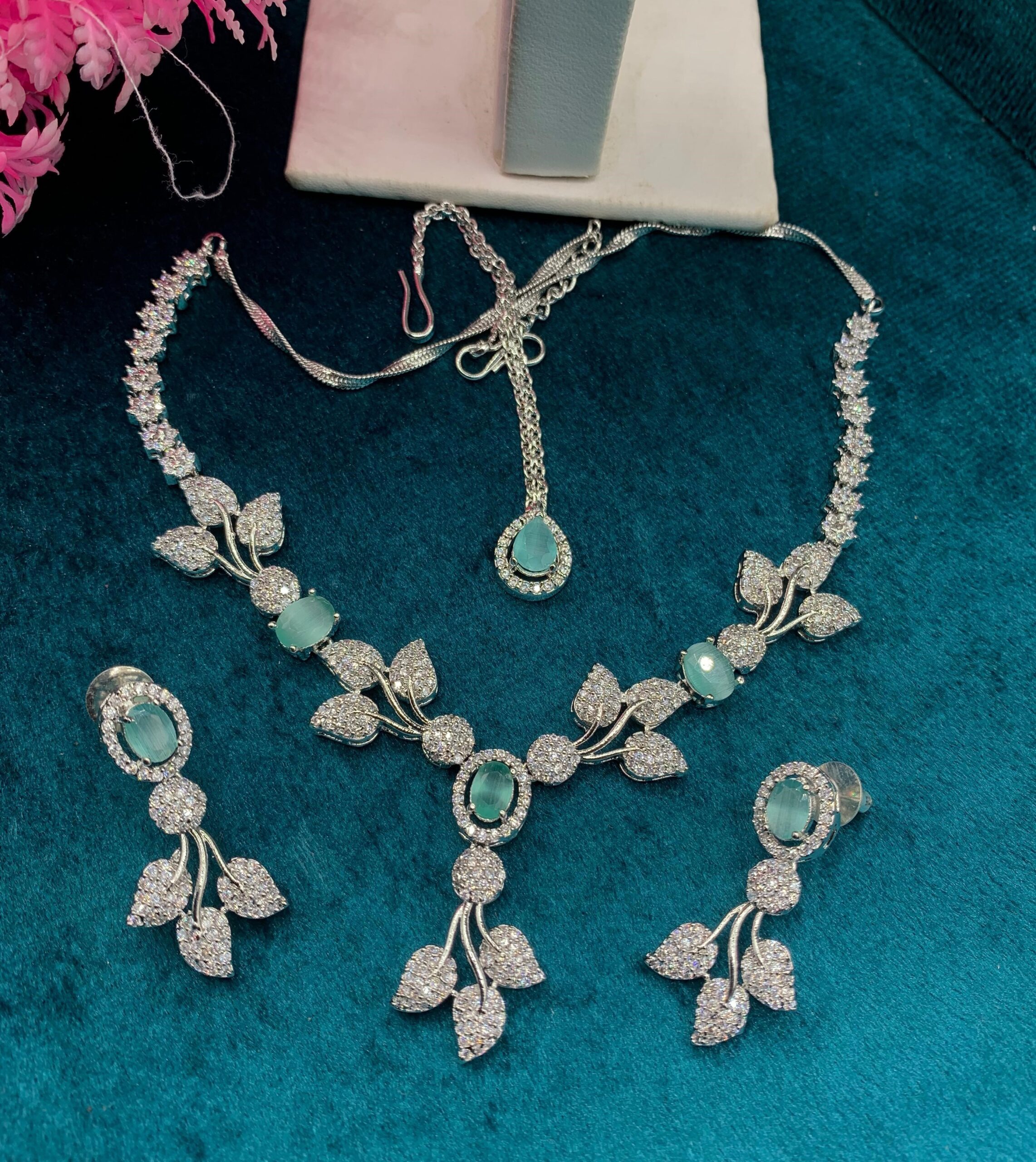 Elegant necklace set with sparkling AD zircon stones and a classy leaf design. Features a one-carat look with a rich colored centerpiece and matching earrings & pendant.