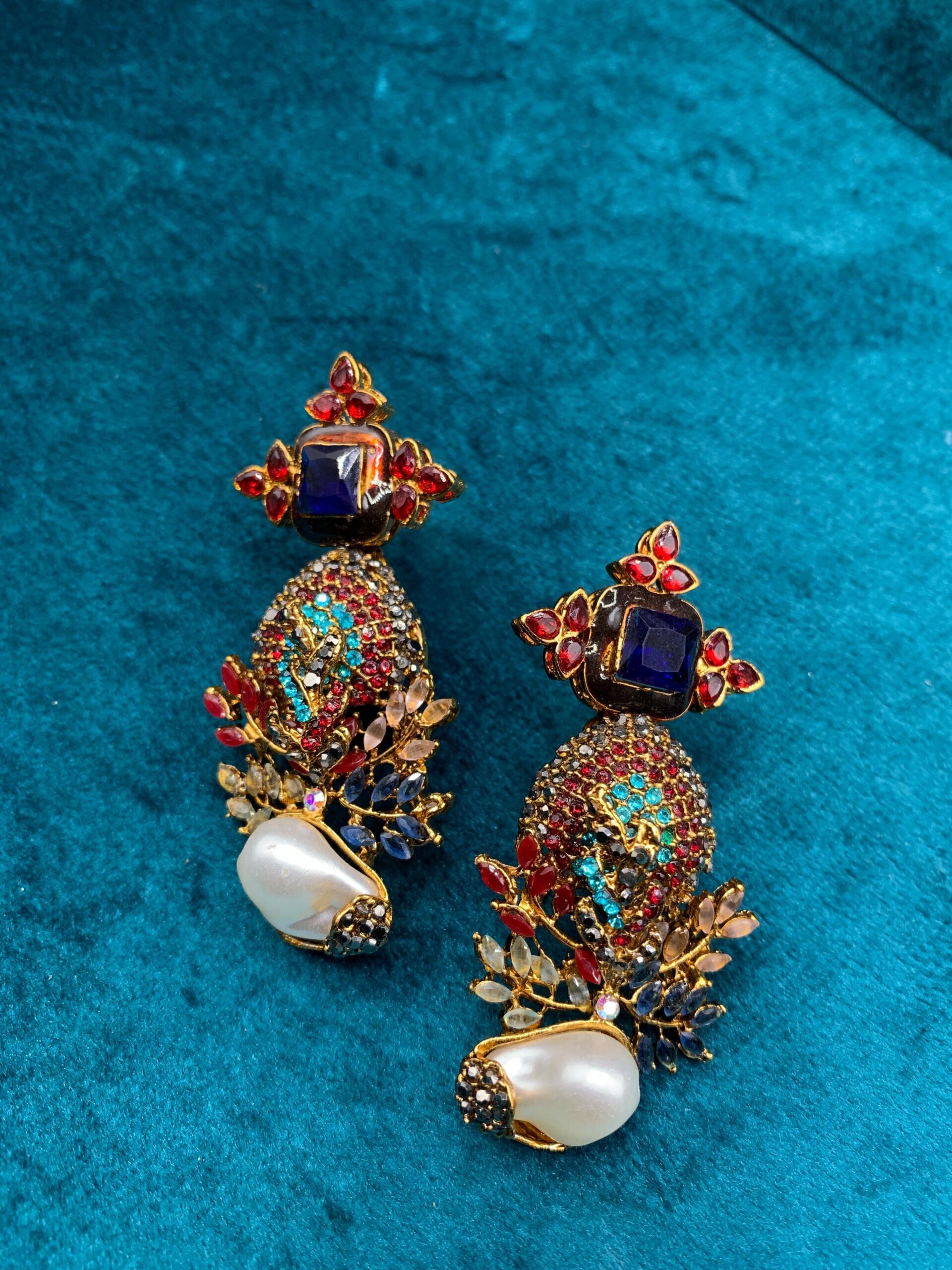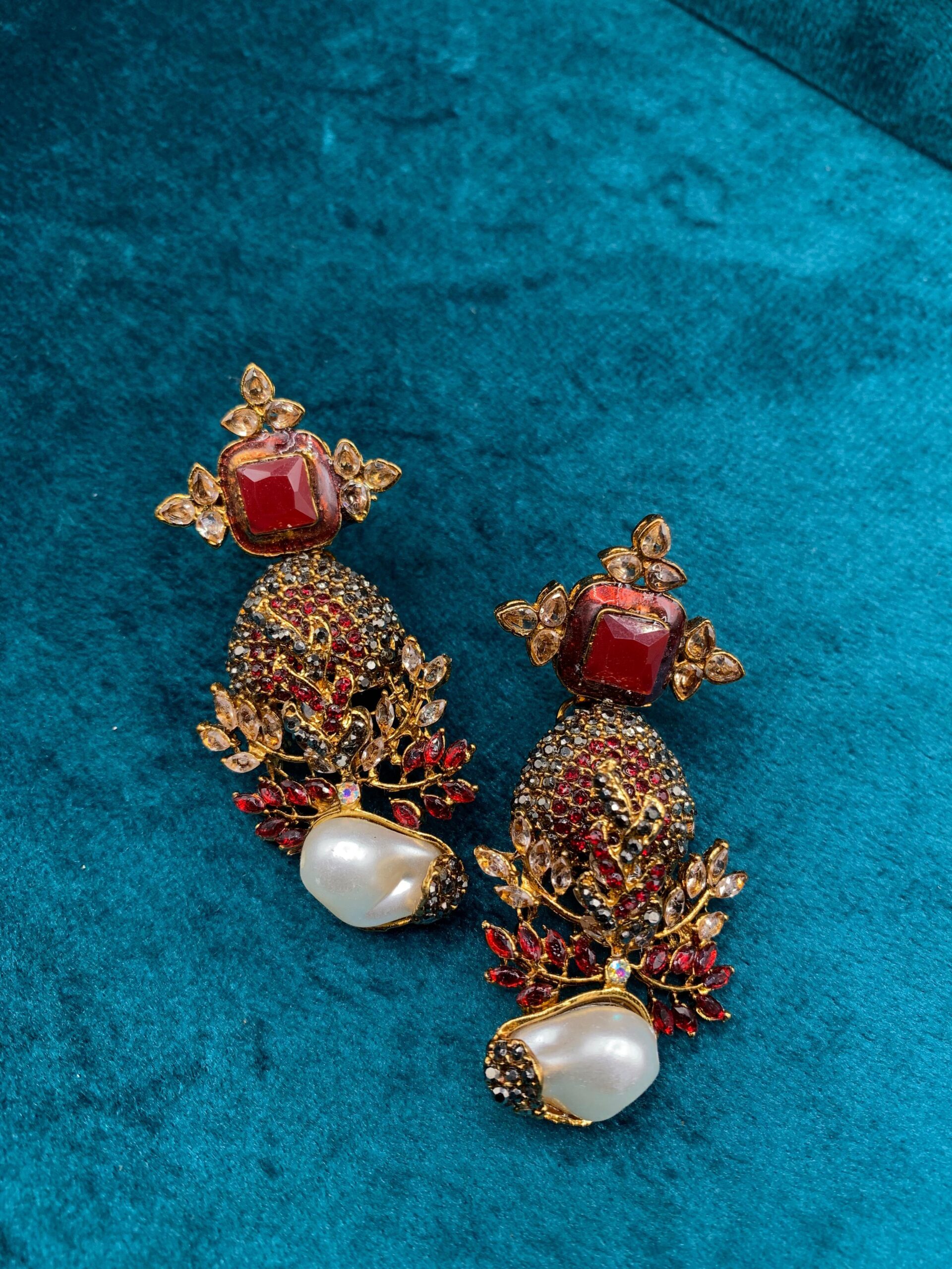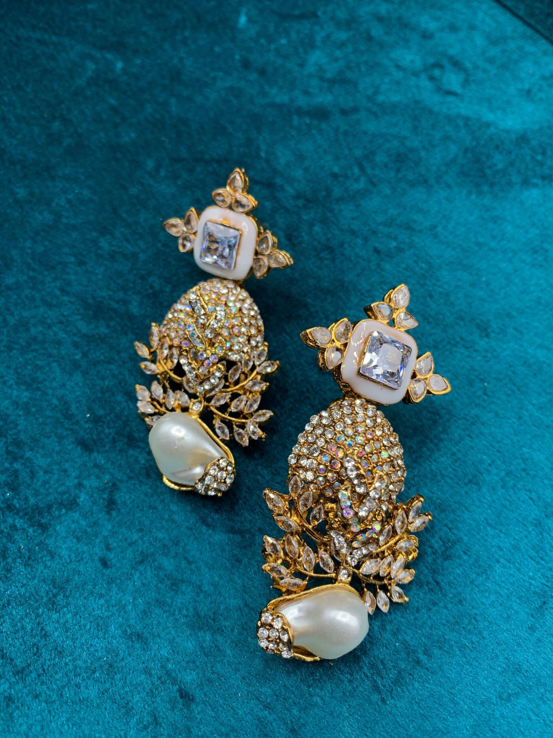 The lower dome features intricately encrusted micro crystals, complemented by a graceful natural pearl drop, adding depth, movement, and sophistication. The antique gold finish enhances its vintage appeal, making it a perfect choice for weddings, festive occasions, and formal events.